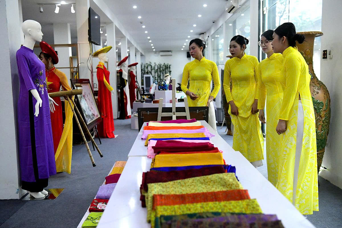 Điểm nhấn của triển lãm nằm ở dấu ấn truyền thống từ các làng nghề nổi tiếng: sự tinh tế của từng đường kim mũi chỉ từ thợ thêu Phú Xuyên, vẻ mượt mà sang trọng của lụa Vạn Phúc, hay tà áo dài khai thác tinh hoa hoa văn Việt trong ngôn ngữ thời trang đương đại. Mỗi sản phẩm là kết tinh của nhiều năm rèn nghề, tâm huyết và niềm kiêu hãnh gìn giữ vốn nghề ông cha để lại.