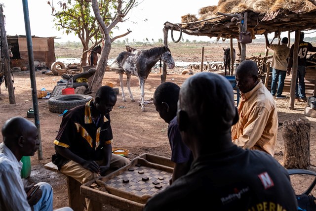 Những người đàn ông chơi cờ đam dưới bóng râm của một căn lều lợp tôn bên cạnh chuồng ngựa chung của Abdo, nơi họ chăm sóc gần 30 con ngựa. Ảnh: Guy Peterson / The Guardian.Một tay đua trẻ tuổi đứng cạnh con ngựa của mình sau khi khởi động. Ảnh: Guy Peterson / The Guardian.Tay đua trẻ đang đợi đến lượt đua. Các tay đua trẻ được chủ ngựa trả tiền, hỗ trợ và cung cấp các thiết bị phù hợp để tập luyện và đua tranh. Ảnh: Guy Peterson / The Guardian.