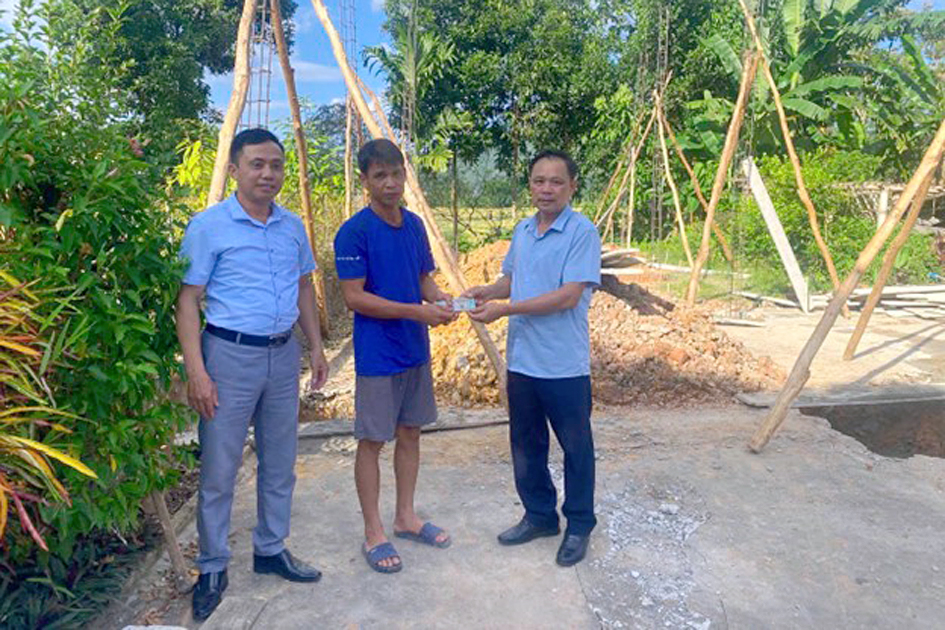Đại diện chính quyền xã Hưng Khánh trao tiền hỗ trợ xây nhà. Ảnh: Chính quyền địa phương cung cấp.